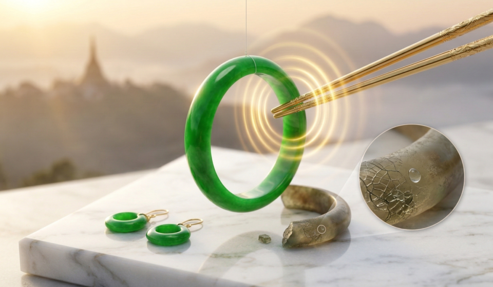- အသံ စမ်းသပ်နည်း (Sound Test): ကျောက်စိမ်း လက်ကောက် ဝယ်မယ်ဆိုရင် ကြိုးလေးနဲ့ ဆွဲပြီး ဒင်္ဂါးပြား (သို့) တခြား ကျောက်စိမ်း တစ်ခုနဲ့ ခပ်ဖွဖွလေး ခေါက်ကြည့်ပါ။ “တီ…..” ဆိုပြီး ကြည်လင်ပြီး ပဲ့တင်ထပ်တဲ့ အသံ ထွက်ရင် Type A ဖြစ်နိုင်ချေ များပါတယ်။ အသံက “ဒုတ်” ဆိုပြီး အသံအက်နေရင် သို့မဟုတ် အသံတိုနေရင် (Dull sound) ကော်သွင်းထားတဲ့ Type B ဖြစ်နိုင်ပါတယ်။